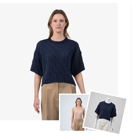 This innovative technology seamlessly merges Virtual Model imagery with standard product shots, creating breathtakingly realistic on-model imagery that truly captivates.